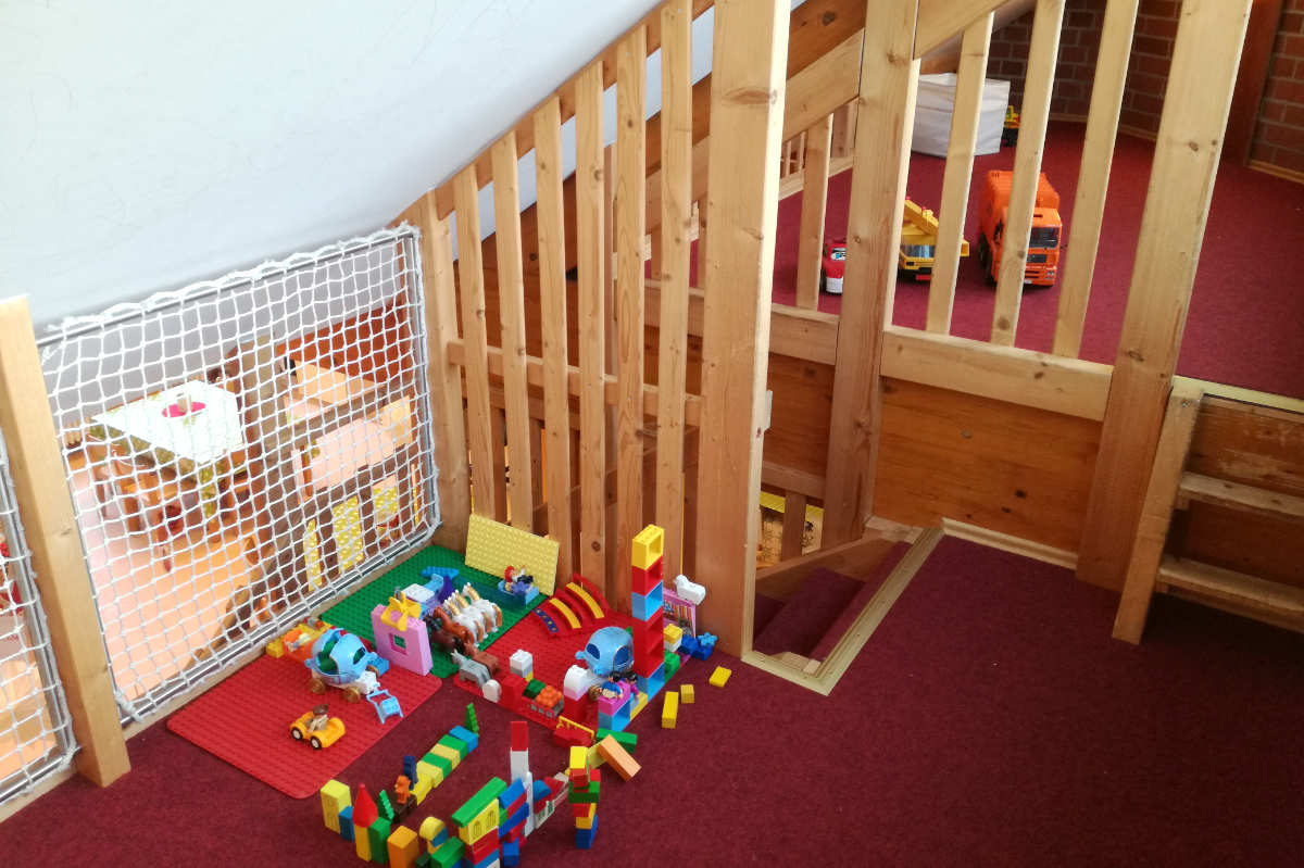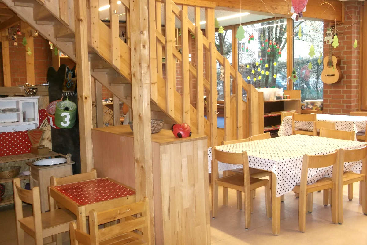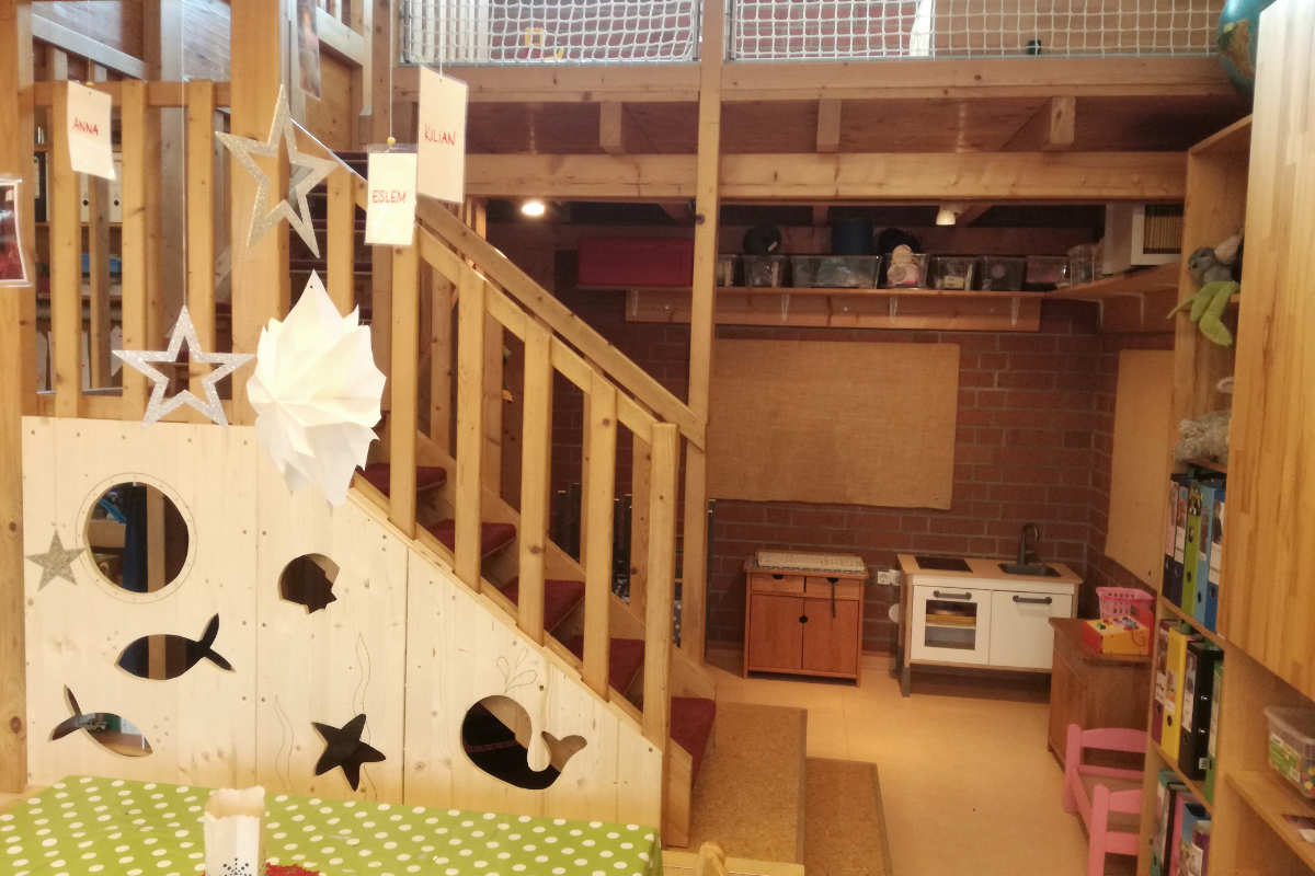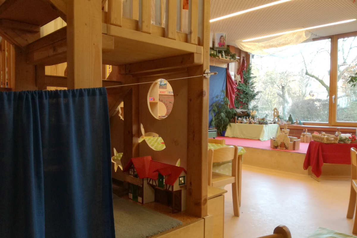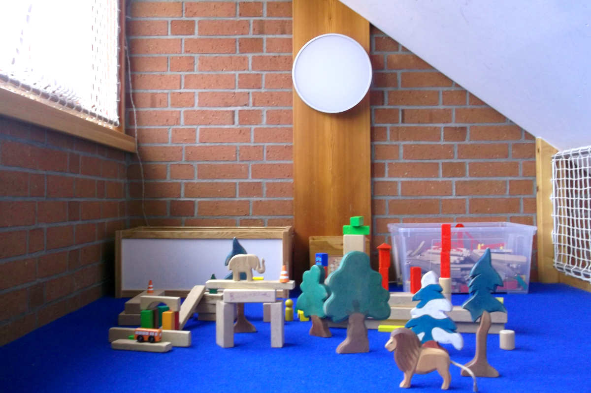 Um unseren Kindern mehr Spielfläche in voll belegten Gruppen anbieten zu können, haben wir in enger Kooperation unserer Elternschaft und heiltherapeutisches Seminar, zweite Spielebenen eingebaut. Die bauliche Konstruktion der Gauben ermöglicht ein helles Tageslicht auf dieser erhöhten Spielfläche. Darunter verbergen sich auch verschiedene Spielnischen und geheime Rückzugsecken.