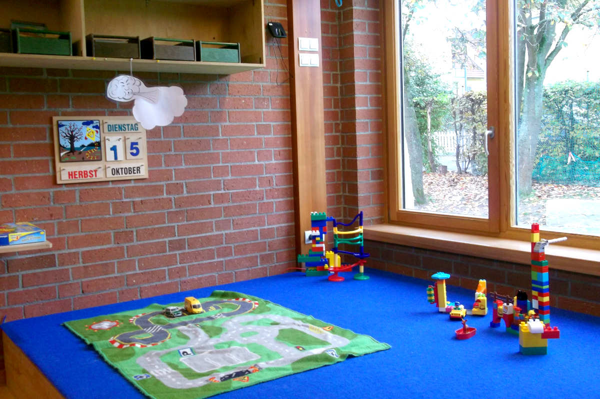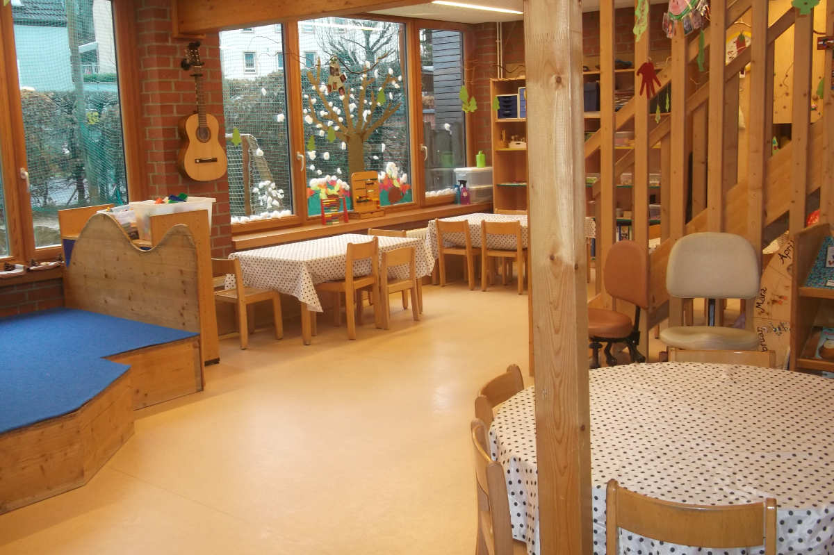 Unsere 3 Kindergartengruppenräume verfügen über die gleiche Grundfläche mit einer großflächigen Fensterseite, die viel Sonne und Licht herein lässt. Es gibt eine Aufteilung in verschiedene Spielbereiche wie Bau- und Puppenecke, Legebereich etc., um eine gute Kleingruppenbildung zu unterstützen. Ein großes, mit Teppich belegtes Podest dient der schnellen Kreisbildung zum Morgen- und Abschlusskreis zudem als Rückzugs- und geschützter Spiel-/Ruhefläche.